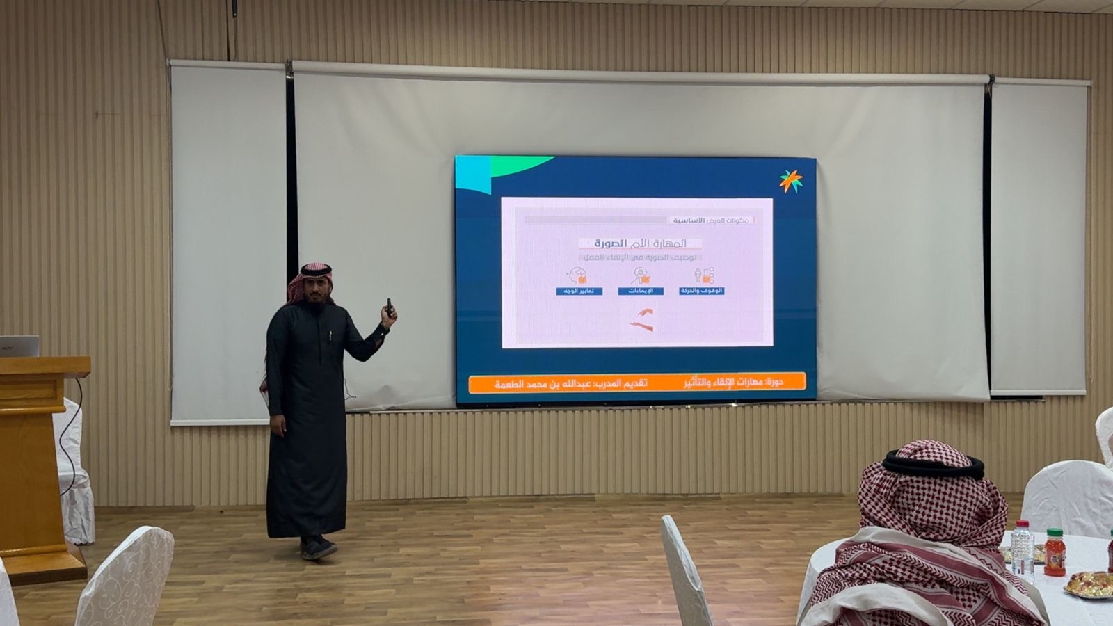 وتناول المدرب خلال الدورة عددًا من المحاور التفاعلية المرتبطة بمهارات الإلقاء والتأثير، شملت مهارات الخطابة، وفن إيصال الأفكار بوضوح، وإقناع الجمهور، إضافةً إلى التركيز على عناصر أساسية مثل تنويع نبرة الصوت، ولغة الجسد، والتواصل البصري، والتنظيم المنطقي للمحتوى، والتحضير الجيد. كما تطرق إلى أهمية فهم الجمهور وتجاوز القلق، باعتبارها مهارات تُبنى بالممارسة المستمرة، وتسهم في تنمية الثقة وتحقيق أهداف التواصل المهني والشخصي.
