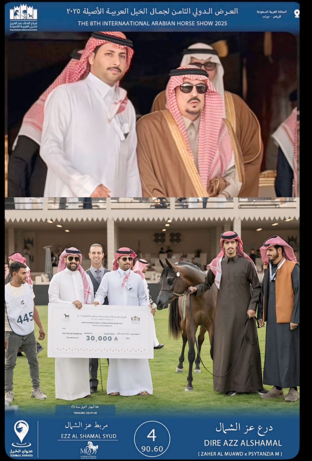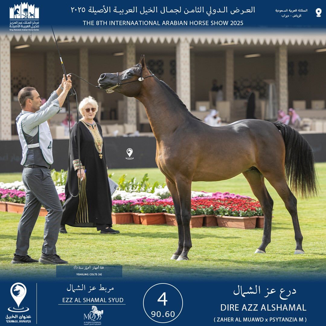 تم تتويج المهر ( درع عز الشمال ) من انتاج وتجهيز مربط عز الشمال بمحافظة طبرجل من منطقة الجوف بالمركز الرابع يوم الأربعاء الماضي حيث حظي مالك مربط عز الشمال الاستاذ / محمد بن عزيز شايش الهمط الشراري بلقاء وتكريم صاحب السمو الملكي الأمير فيصل بن بندر بن عبدالعزيز آل سعود أمير منطقة الرياض