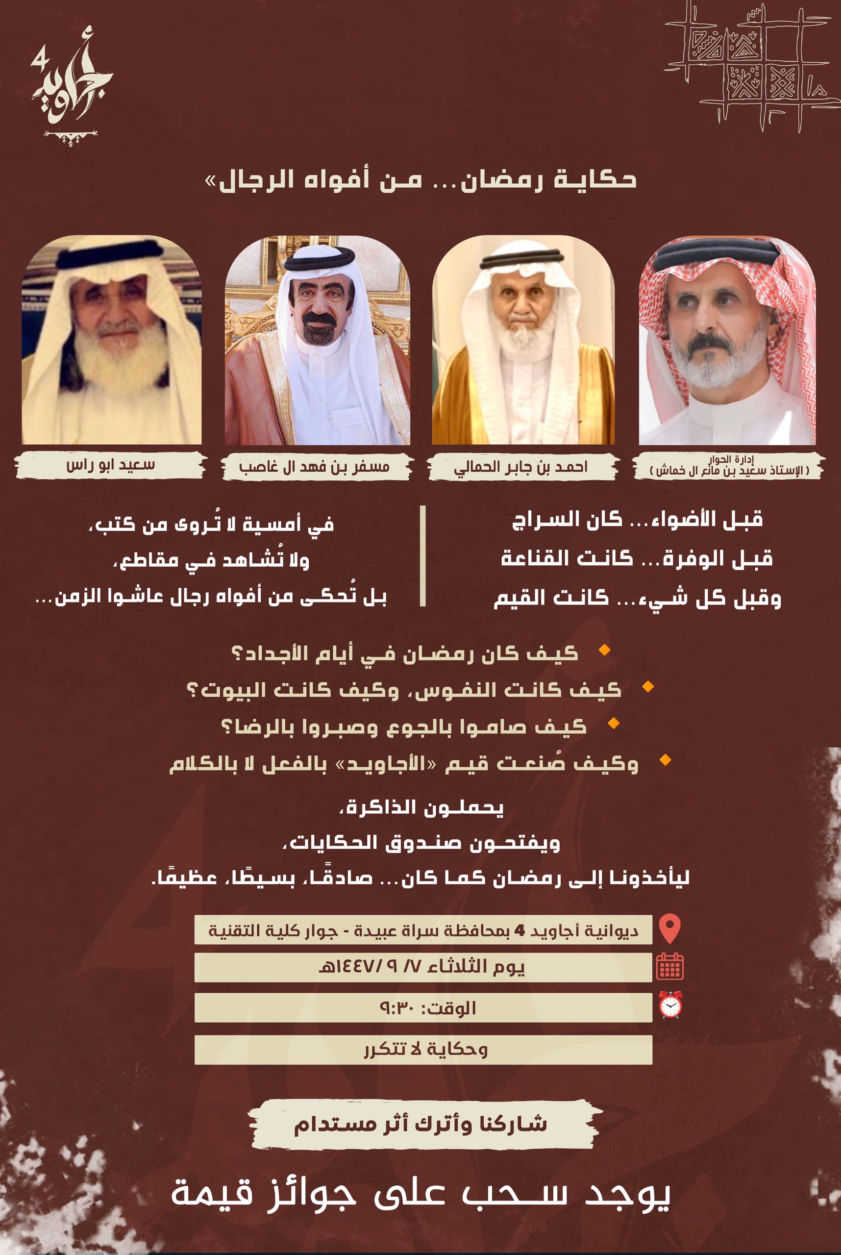 نفذت مساء يوم الثلاثاء ديوانية «أجاويد 4» بمحافظة سراة عبيدة، أمسية رمضانية تحت عنوان «حكاية رمضان… من أفواه الرجال»، وذلك في أجواء رمضانية دافئة أعادت للحضور ملامح الزمن الجميل وقيمه الأصيلة.